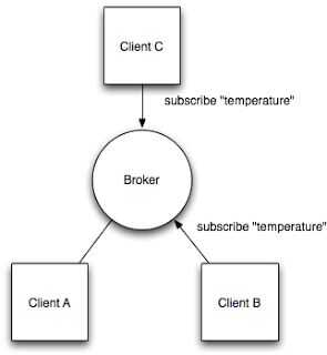 Primero vamos a ver este proceso en el diagrama de bloques que va a ser fácil para que usted pueda entender. Segunda imagen muestra el diagrama de bloques. Básicamente aquí tenemos uno y 3 clientes suscritos al tema "temperatura".