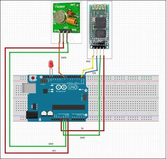 Para este proyecto utilizo un protoboard, pero se puede simple conectar el transmisor de RF y el HC06 con arduino, preste atención a la conexión de HC06, arduino puerto RXD -> HC06 TXD y Arduino puerto TXD -> RXD HC06.