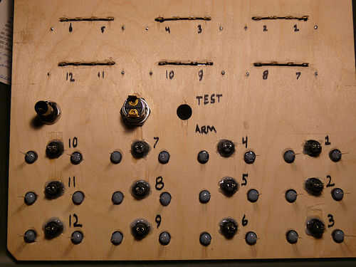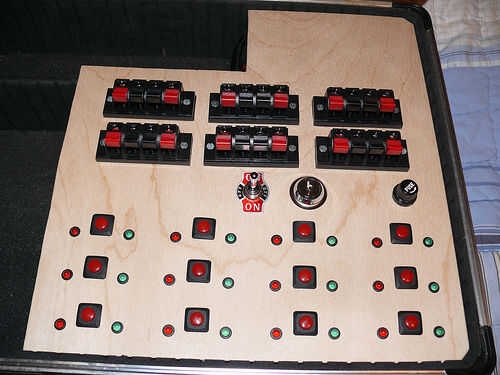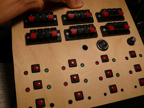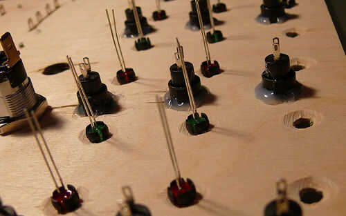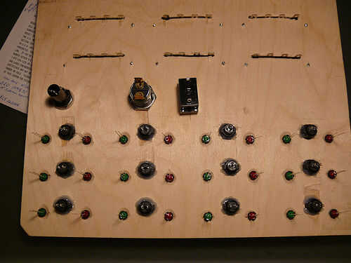 Después de eso, instalé el interruptor dominante, interruptor y portafusibles. Todos estos componentes tenían tuercas en la parte posterior que se fijan a través de los orificios de montaje. Apriete con una llave inglesa o alicates, pero tenga cuidado de no astillar la madera; no tienen que ser excesivamente apretado, apenas lo suficientemente apretada como para no girar cuando se gire la llave o se voltee el interruptor, etc..