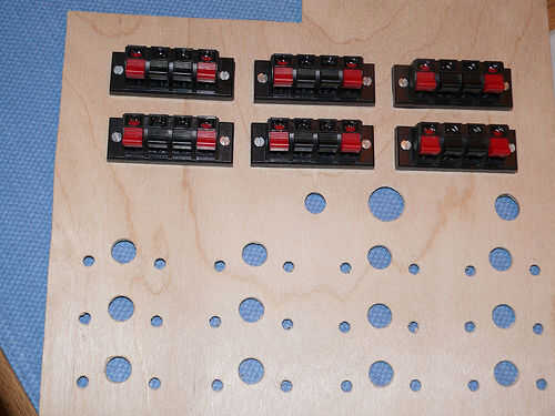 Agarra sus 12 tornillos y el destornillador, luego coloque cada bloque terminal del altavoz en cada una de las seis ranuras en la parte superior de la madera. Si uno o dos bastante no caben por la ranura, cambiar hacia fuera con otro. Algunas de la terminal de altavoz para soldar lengüetas fueron propagación más hacia fuera que otros en la mía, y todos terminaron cabiendo en una ranura u otra.
