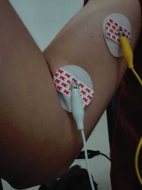 Ahora es la hora de conectar los electrodos tienes que poner 3 electrodos en el brazo, uno en la parte inferior del músculo como se indica en la primera foto, esto servirá de referencia a 0, los otros dos electrodos tienen que ser en el músculo a medida, espaciados unos 5 cm.