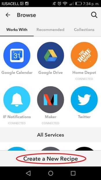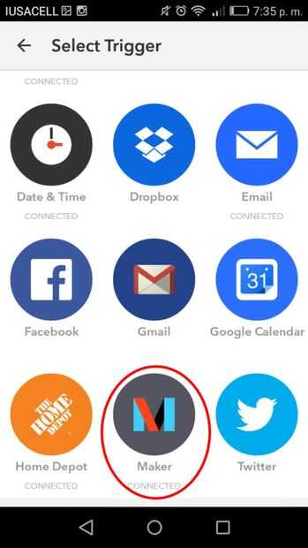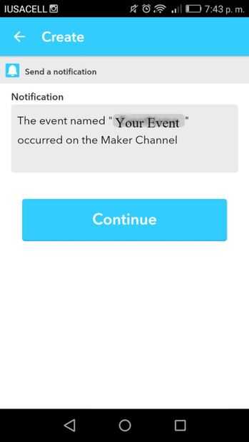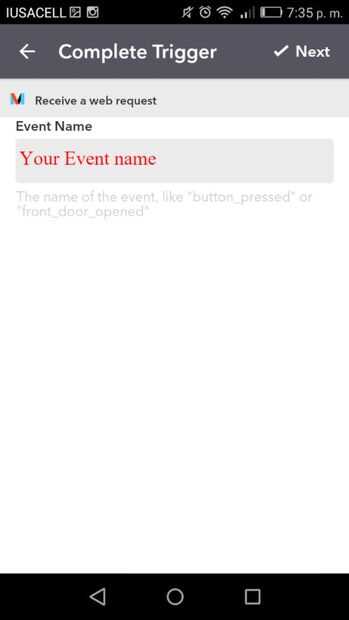 Necesitaremos tener instalada en nuestro smartphone, una vez abierto vamos a crear una nueva receta de como se muestra en las capturas de pantalla, slsecting primero el gatillo que en este caso es Web solicitar el servicio del fabricante de la aplicación IFTTT, hay que añadir el nombre del evento (excepto este nombre) después de esto seleccionamos la acción que realice, en este caso nos slect la notificación mediante la aplicación , pero puede seleccionar cualquier otra cosa.