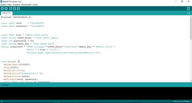 El código puede descargarse de aquí, los únicos cambios que requiere es cambiar el SSID y la contraseña de yor net, crea tu nombre de evento antes y su llave de paso antes.