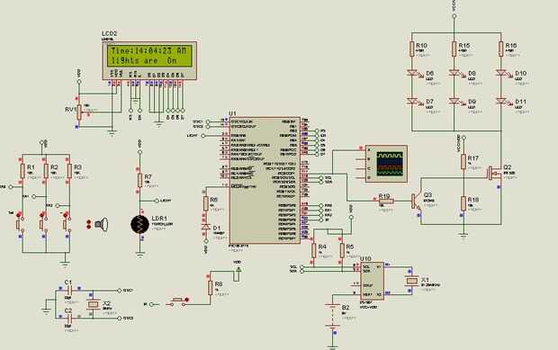 Microcontroladores basados intensidad automática control de proyecto de alumbrado público está diseñado utilizando el microcontrolador pic16F877A automáticamente el control intensidad de luces de la calle. También puede encender y apagar luces de la calle automáticamente. Resistencia dependiente de luz se utiliza como un sensor de luz a la luz del sentido y la intensidad de la luz. Otra función de este proyecto es el control de intensidad de luz de la calle según la intensidad de la luz por el sol. También detecta vehículos en carreteras en la noche. Si hay cualquier vehículo en el camino después de las 12:00 am en la noche, la luz se enciende automáticamente. De lo contrario luces de la calle permanece apagado después de 12:00 am. En tiempo del día calle apagarla totalmente. No hay necesidad para control manual de luces de la calle después de implementar este proyecto. Reloj de tiempo real DS1307 se utiliza para realizar un seguimiento de tiempo en tiempo de día y horarios de la noche. Reloj de tiempo real DS1307 mantenga registro de tiempo y muestra en pantalla. Microcontrolador PIC16F877A Lee tiempo y tomar acciones basadas en tiempo. Tres botones se utilizan para fijar hora del reloj en tiempo real. Después de 12:00 am intensidad de luces de la calle empezar a disminuir y girar completamente en 1:00, si no hay ningún vehículo en carretera. Después de 1:00, sensores infrarrojos detecta vehículos en carretera, si hay cualquier vehículo en carretera, luces de la calle se enciende automáticamente y en 5 minutos. Después de 5 minutos calle apagarla otra vez autimatically. Para más detalles visitecódigo, su funcionamiento y diagrama del circuito completo