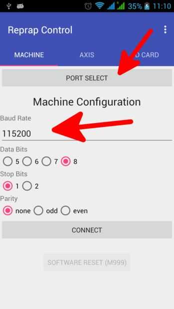 RepRap Control proporciona tres maneras, voy a usar conexión directa USB OTG.