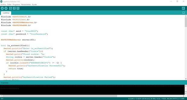 Ahora si tienes todo instalado es tiempo para programar su ESP8266 este programa hecho por mi funciona en todas las versiones del ESP8266 incluso en el ESP-01, si utilizas esto tendrá que cambiar sólo la GPIO utilizada en el programa, este programa crea una página web a la IP donde se puede acceder y le pedirá un usuario y una contraseña , antes de que definidas en el programa, una vez verificado el usuario entrará a una interfaz muy simple con sólo un botón para cambiar el estado de la luz.