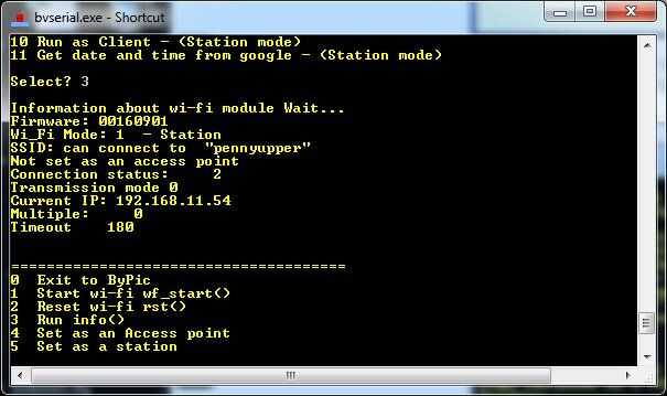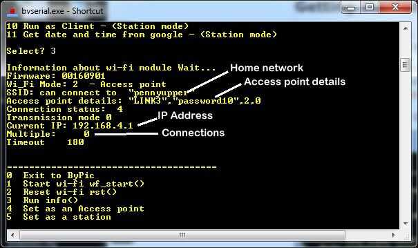 Los bits importantes se han destacado en blanco. Esto nos indica que el modo de operación actual es como un punto de acceso y si tuviéramos que analizar en otro dispositivo (laptop, teléfono etc.) vemos 'LINK3' como un circuito abierto (el último 0) punto que podríamos conectar a acceso. Podemos comunicar con él a través de la dirección IP como se muestra. Esto es 192.168.4.1 y actualmente no se puede cambiar. Si modo Wi_Fi no es 2 luego presione 4 ya tenemos el módulo para ser un punto de acceso (AP)