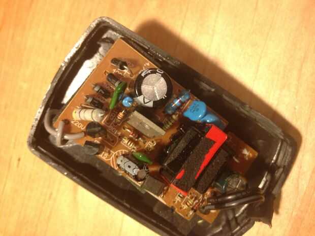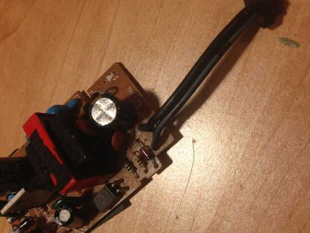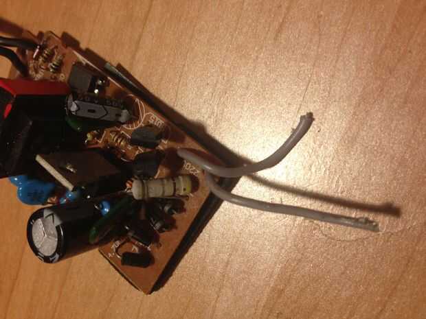 Ahora coge ese convertidor AC-DC y pop abierto como se muestra. Tomamos la placa de circuito completamente hacia fuera y corte los cables que se sueldan a la clavija macho.