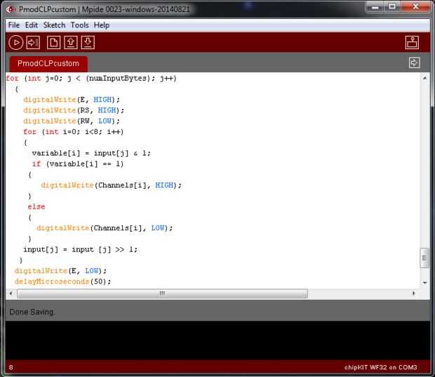 Desde aquí, descarga el archivo .pde abajo. Este archivo es el archivo de firmware personalizado que hice para el PmodCLP usando la hoja de datos para la pantalla LCD. Nota: este archivo de firmware personalizado sólo funciona para el chipKIT WF32. Si tienes un dispositivo chipKIT diferente, visite el enlace de comando personalizado por encima a LabVIEW MakerHub. Toma mi función personalizada del archivo .pde e incluyen la declaración de avance y la función de comando personalizado de fijación descrito en la guía.
