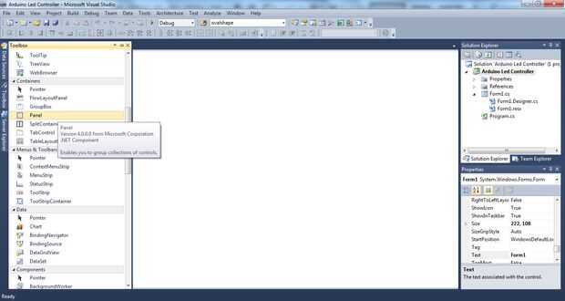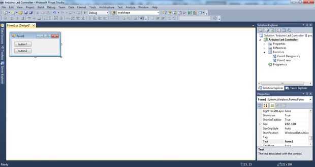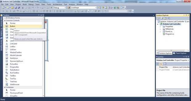Para este ejemplo, voy a hacer 2 botones para encender un led conectado al pin 13 de encendido y apagado. Primero abrir la caja de herramientas y haga clic en y arrastre el botón de la pantalla. Hacer esto dos veces. Agregar dos paneles y cambiar el tamaño de la forma, ver las fotos para verlo.