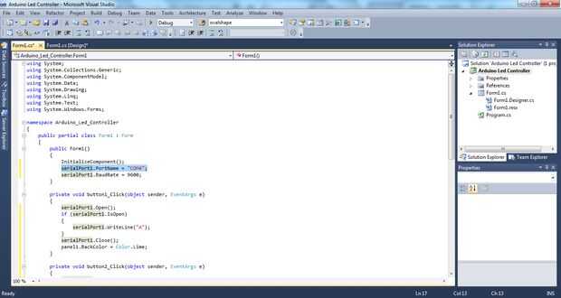 entonces vas a tener que ir a la pantalla de diseño y haga clic en el puerto serial en la parte inferior izquierdo de la pantalla. Vaya a la sección de propiedades y cambiar el PortName a lo mismo que hizo que el código. en mi caso es el COM4.