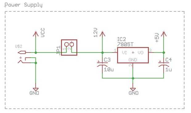 Los LEDs son alimentados por una verruga de la pared de 12V, y por eso es necesario un regulador de 5V a la tensión para el micro. También es un lugar para dos cables de puente, para que pueda incluir un interruptor separado.