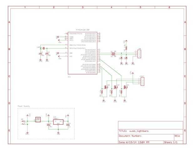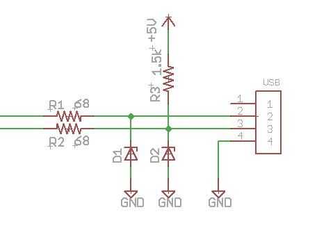 El protocolo USB utiliza dos cables de señal (D + y D-) para producir una señal diferencial. Es decir, cuando un cable es alto, la otra se tira bajo y viceversa. USB reconoce una señal de 0.0V - 0.3V como 'baja' y una señal de 2, 8V - 3.6V como 'alto'. Enviando información desde un ordenador para la micro no es problema, como el micro puede leer 3.3V como 'alto'. Hay un problema, sin embargo, que el micro enviará un 3.3V señal a la computadora. Una solución es ejecutar el micro en 3, 3V. Otro es bajar la tensión en los cables de señal. El VUSB wiki tiene dos opciones para cómo interfaz puerto USB de la computadora con un micro. Elegí B solución que podría funcionar el micro (y así cambiar los FETs) con 5V en vez de 3, 3V.