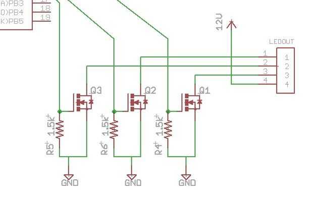 Los tres canales PWM en el micro se utilizan para alternar tres FETs, que a su vez los LEDs en coche.