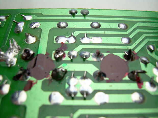 En el otro lado de la PCB, marca donde los cuatro de la soldadura de las placas son para los dos interruptores. (Encendido y apagado)