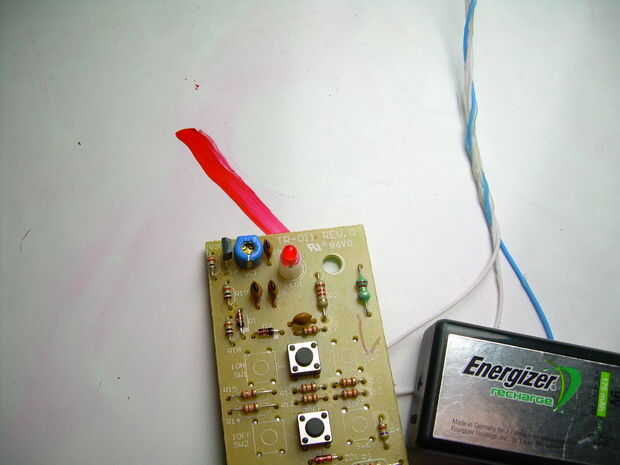 Porque cuando no se pulsa el interruptor, es especie de empujando y sosteniendo el botón 'OFF' como durante mucho tiempo la batería está conectada. Sólo usé mini cables de puente para conectar la batería de nueve voltios para el transmisor. Usted puede Agregar un interruptor SPST y un clip de la batería de nueve voltios para que sea oficial.