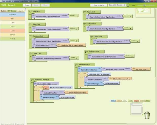 El editor de bloques es donde la magia ocurre sin embargo, al hacer la aplicación, asegúrese de que cada botón que envía un byte de diferentes. Como se puede ver en mi editor de bloques, cada botón de color envía un número diferente (es decir, 1-8). Nuestro Arduino va a recibir este 'byte' específico y se ciertos pins y en base a lo que recibe. Asegúrese de utilizar una aplicación bluetooth simple para encontrar dirección del módulo así que usted puede asociar su dispositivo el módulo. Ingrese ese número en el editor de bloques
