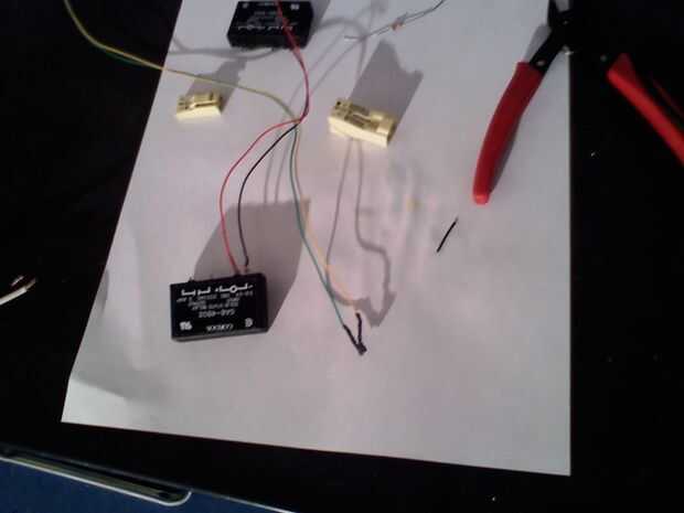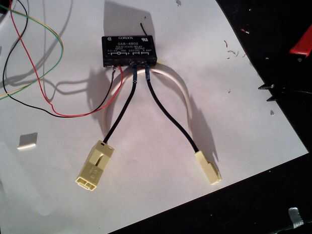 La soldadura de la tierra (negra) a la entrada del relé - y el control (amarillo) a entrada de relé + (el código de color en la imagen es diferente de lo que puse en la portada, ya que he cambiado mi mente sobre lo que tendría sentido).