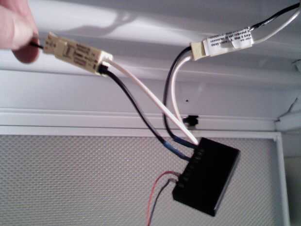 Echar un vistazo a la conexión de las líneas de corriente del interruptor en el balasto. Podría ser capaz de conectores de orden (vende la serie Wago 930, que es lo que teníamos de Newark Electronics). Entonces no necesitará cortar cables existentes y puede quitar el sistema si algo sale mal.