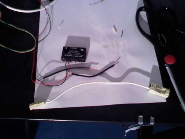 Suelde o atornille (dependiendo de su servidor) el cable negro (caliente) a través del relé. Asegúrese de utilizar del encogimiento del calor y cinta aislante. Empuje los conectores de los cables negros y el blanco (neutro) y tierra (verde) son sólo directamente a través de conector a conector.