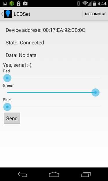 2. Abra la aplicación para Android luz azul. Si todo funciona correctamente debería ver el módulo BLE dentro de gama. Seleccione!