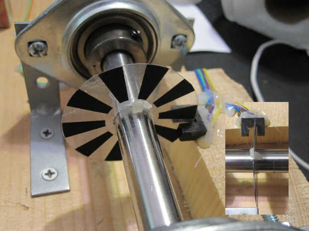Utilizamos este generador de rueda encoder online para imprimir ruedas de encoder óptico casero en una impresora láser. Hemos grabado dos ruedas junto con cinta de doble cara para asegurarse de que las piezas negras eran bastante opacas.