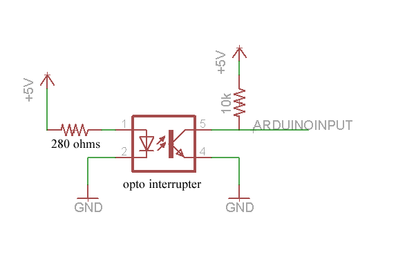 La pieza negra en forma de U es un interruptor de opto, que básicamente tiene un Haz que es roto por la rueda del codificador. Esto provoca una interrupción en la roboduino, provocando una función que realiza un seguimiento de la velocidad de la corriente y el número de rotaciones.