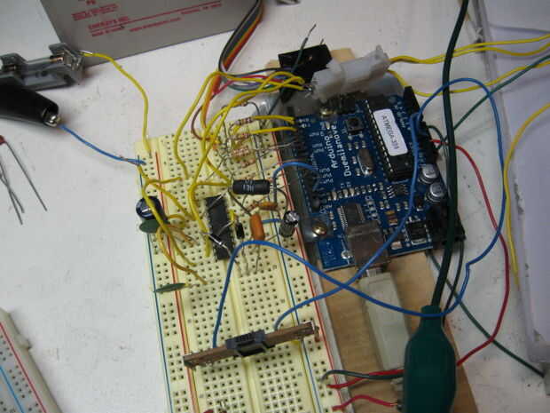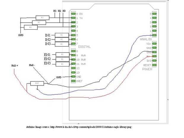 100 k ohm potenciómetro conectado a + 5V y gnd en el pin analógico 0 en el medio los extremos. Este potenciómetro se utiliza para controlar la velocidad del motor y la cantidad de frenado.