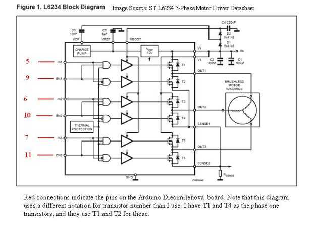 El L6234 tiene un inusual conjunto de entradas para controlar el puente medio 6 transistor. En lugar de tener una entrada para cada transistor, hay una entrada de habilitación (EN) para cada una de las tres fases, y luego otro de entrada (IN) elige cual transistor de la etapa se enciende (superior o inferior). Por ejemplo, para encender los transistores 1 (superior) y 6 (inferior), EN1 y EN3 son alta (EN2 bajo para evitar que la fase) y IN1 es alta y IN3 es baja. Esto hace que la combinación de la fase A-C.