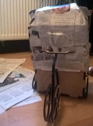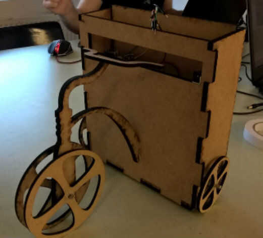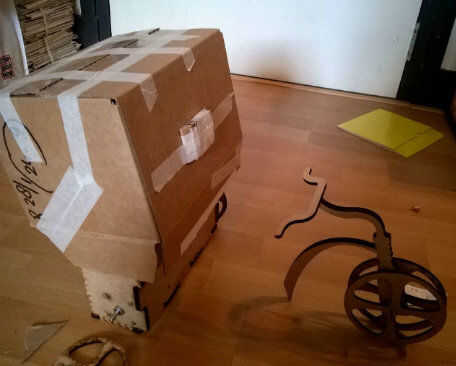 Como habrás dado cuenta de mi proyecto de arduino es en forma de un oso en un triciclo (que secretamente tiene cuatro ruedas para el equilibrio). Hice esta caja con corte por láser, cartón y papel maché.