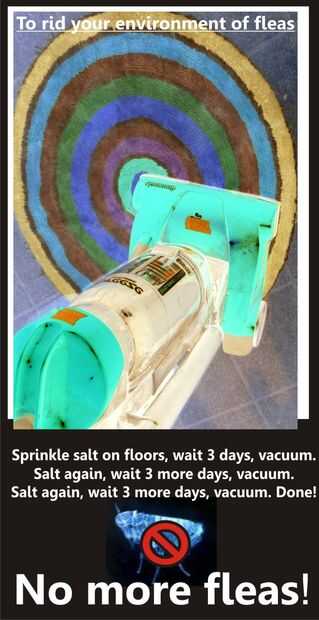 Los huevos de pulgas maduran cada 3 días, así si rocías con sal el suelo y los muebles durante al menos 9 días, usando la aspiradora cada 3 º día durante 9 días, habrás interrumpido un ciclo de vida completo de la pulga. ¡Se debe vaciar la aspiradora después de cada limpieza, porque si no las plagas simplemente se escaparán de nuevo y volverán a infestar tu casa! También puedes echar sal en los porches, las perreras, etc. para matar los huevos y mantener tu control de las pulgas. Bórax funciona como una alternativa a la sal, pero tiene unos peligros. En zonas con mucha humedad es posible que tengas que usar un deshumidificador junto con el tratamiento con sal para conseguir deshacerte de las pulgas.