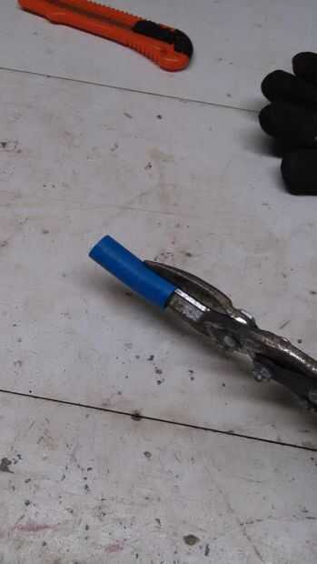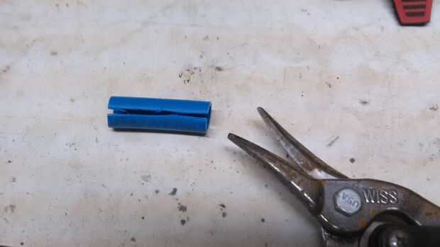 Entonces usé tijeras para cortar el PEX a lo largo de un lado para que se puede abrir un poco. Probablemente te darás cuenta que el PEX se curva en una dirección. Es mejor hacer el corte a lo largo del interior de la curva para que la pieza resultante sigue la curvatura del tubo aspersor más de cerca.