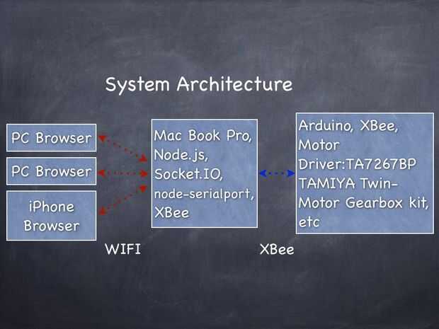 La arquitectura del sistema del diseño se dibuja encima. He instalado serialport(a Node.js library) nodo, Node.js y Socket.IO en mi MacBookPro. Node.js controla conexión XBee. Socket.IO controla la pantalla de la Web.