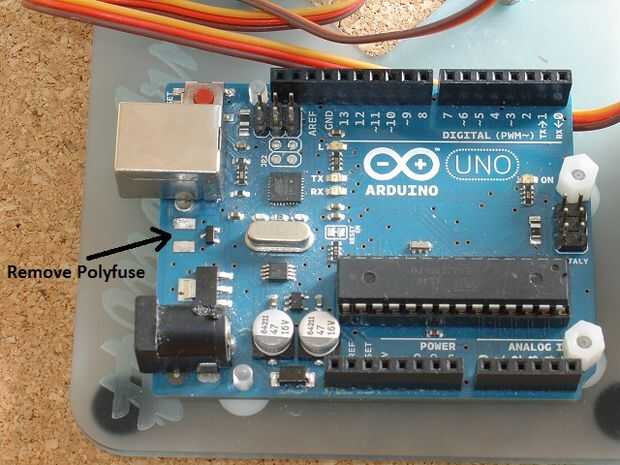 Anteriormente el brazo del robot restablecer y soltar la conexión BT intermitentemente. Esto fue porque la fuente USB via el UNO de entrada no puede dar el > 1A actual necesitadas de los servos. Hay un polifusible re-configurable en el Consejo de Uno que está valorado en 1A. Para solucionar esto, el polifusible fue quitado del tablero Uno (ver foto arriba) y un paquete de energía de 5V 3A conectados directamente a Uno 5V, GND pernos encabezado, a través de la placa de prototipo. Para programa de la ONU, es necesario conectar el USB cable y también Conecte la fuente de alimentación. Quitar el polifusible aislados el UNO de la fuente de alimentación USB.