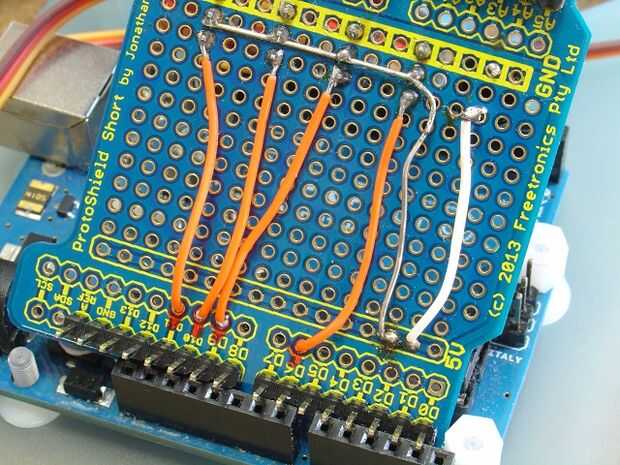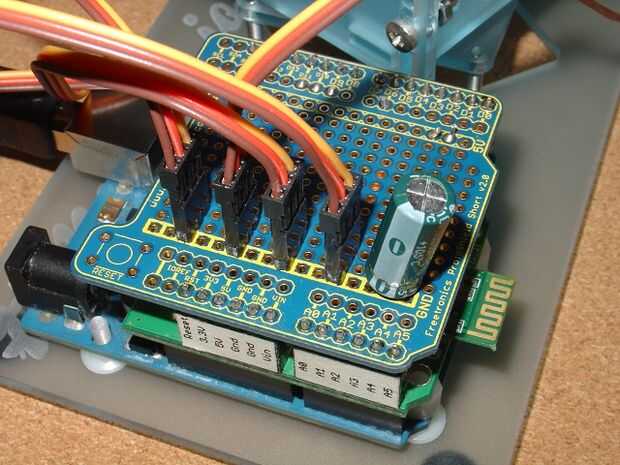 En los conectores de servo, el cable marrón es GND y el alambre rojo medio es + 5V y el cable amarillo es el cable de control. Los cables de control están conectados a salidas D6 (rotación), D9 (entrada/salida), D10(up/down), D11(gripper).