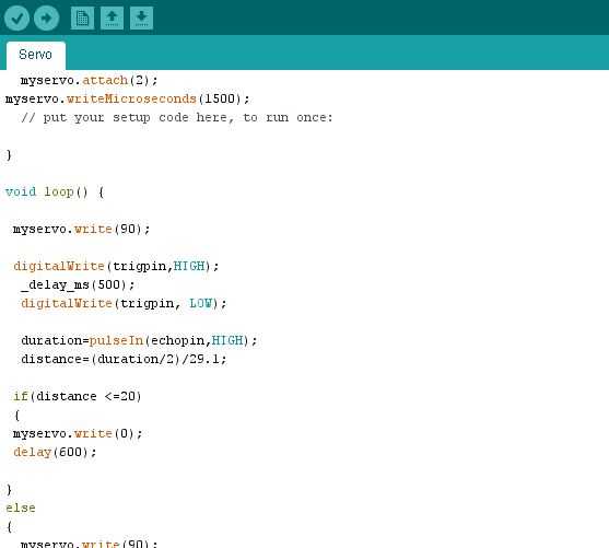 int duration, distance;//declare variable for unltrasonic sensor void setup() { Serial.begin(9600); pinMode(trigpin, OUTPUT); pinMode(echopin, INPUT); myservo.attach(2);// attach your servo myservo.writeMicroseconds(1500); // put your setup code here, to run once: }