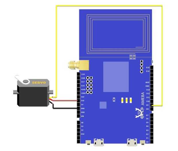 Un servo típico es posicionamiento de 0 a 180 grados y tiene 3 cables, el cable rojo es para la energía, uno negro o marrón se debe conectar a tierra y la otra es para datos de la señal. Usamos señal PWM para controlar el ángulo de rotación del eje del servo. La frecuencia de la señal es de 50Hz, que es período 20ms. Cada servo define su ancho de banda del pulso, que generalmente es 1ms ~ 2ms. Para controlar el ángulo de rotación, por ejemplo si la longitud de pulso de 1ms gira el eje para grado 0, entonces pulso de 1,5 ms gira el eje a 90 grados, y pulso de 2 ms gira el eje a 180 grados. El cable de señalización es conectado al pin de tablero de Ameba Aruino 9 como se muestra en el diagrama de arriba.