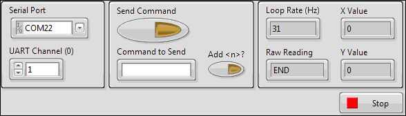 Descargar la VI abajo y abrirlo. En el lado izquierdo del panel frontal son los valores de LINX. Seleccionar el puerto COM que la placa está conectada a y utilice UART del canal 1.