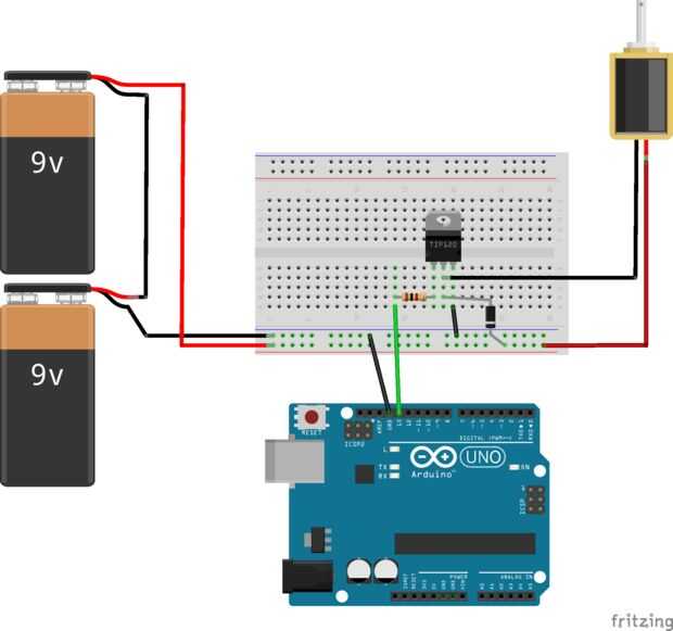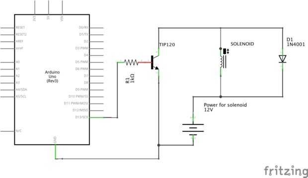 Estoy usando un solenoide de tracción nominal para 12 a 24 voltios (lo consiguió aquí), que tiene un montón de retroceso. Necesitarás algún tipo de resorte a tire hacia atrás el eje hacia fuera después de se tira - usé una pequeña longitud de alambre envuelto alrededor del eje para crear un muelle improvisado. En un tipo diferente de configuración se puede usar la gravedad para sacar el eje vuelve a salir (pero necesita algunos de tapón para evitar que el árbol caiga completamente).
