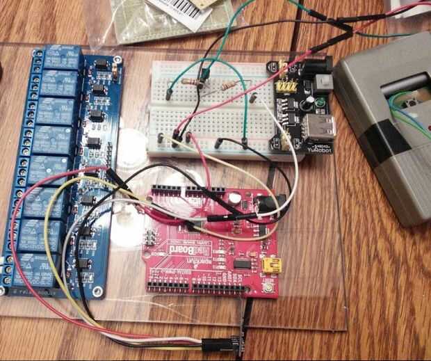 Me mach'ed todo esta arriba en una placa sin soldadura que se muestra en la imagen. (ni el RedBoard ni el módulo de relé grande que esta en la foto se utilizó para este proyecto)