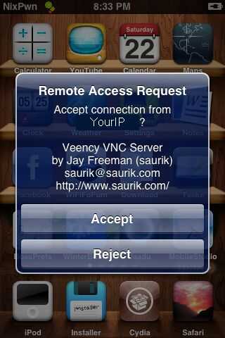 Tu iPhone/iPod ahora mostrará un mensaje preguntando si desea Aceptar conexión de "yourcomputer'sIP"?