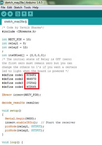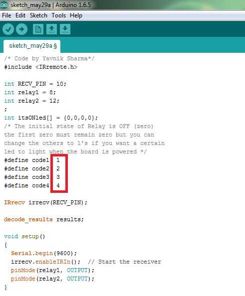Primero descargar el simple programa de Arduino he creado. Entonces en lugar de números 1 2 3 4 como se muestra en el área roja escribir el código hexadecimal del botón que desea utilizar en remoto de la TV. Aquí el código 1 establece el relé 1 en el pin digital 8 como alta y el código 2 la define como baja. El código3 fija relé 2 en pin 12 como alta y código 4 establece bajo. En la segunda foto se puede ver cómo he cambiado los valores según el código hexadecimal de mi botones de control remoto de TV.