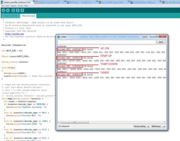 Ahora tenemos que ir a Menú > herramienta para abrir las ventanas de Monitor serie. Después de su apertura, punto de su Control remoto al receptor IR conectado a tu Arduino y cada botón uno por uno. Obtendrás algo parecido a la imagen de arriba.