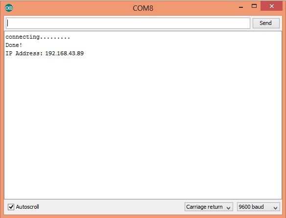 Después de subir el código, abra al monitor de la serie y esperar la wifly shield iniciar su propio punto de acceso o conectar con lo hotspot especificado. El serial monitor le mostrará la dirección ip del escudo wifli.
