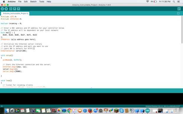 En la Web de Arduino, obtendrá una imagen como la mostrada. Se enchufe en el acorde USB en su ordenador y el otro extremo en el arduino. El cable Rj-45 se conecte a su escudo de ethernet y router inalámbrico wifi. Los dos primeros botones de la página de Arduino como la imagen que se muestra es lo que tienes que pulsar "Verificar y cargar" Oprima verificar primero y una vez verificado, pulse subir. Usted debe recibir un mensaje en la parte inferior de la página diciendo subido a Junta.