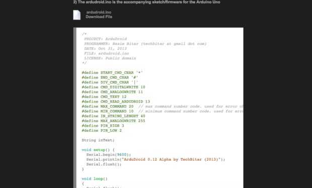 El crédito completo para el código de Arduino y la aplicación va a su creador Hazim Bitar. Increíble trabajo. Usted puede encontrar el código y también una configuración separada para usar el módulo de Bluetooth HC-05 aquí: http://www.techbitar.com/ardudroid-simple-bluetoot...