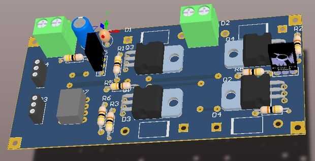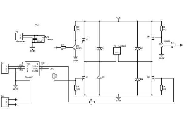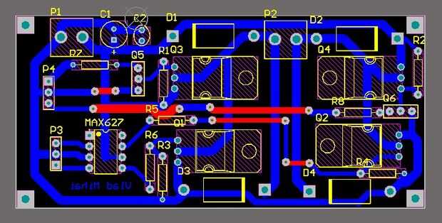 Mi concepto es un puente H de montaje utilizando solamente el lado de baja mosfet para controlar velocidad del motor, y mosfet de alta sólo se utiliza para abrir y cerrar el circuito. Para mosfet de lado bajo uso IRF3205 que tienen muy baja RDS en carga baja de la puerta. Para el uso IRF5305, que también rds en pequeñas y baja carga de la puerta del lado de hig. Para cambiar el lado de baja MOSFET utilicé driver corriente 2A, MAX627.