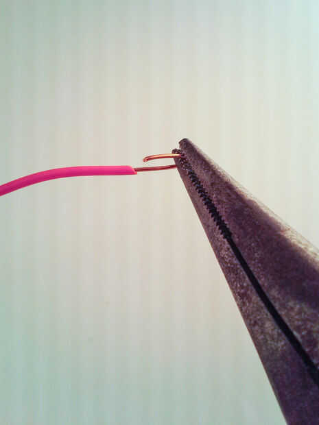 Doblar el extremo del alambre con los alicates y lazo en el agujero en el botón. Si usted botón lleva falta un agujero o es demasiado pequeño, deberás envuélvalo alrededor y lo de la soldadura, especialmente si no hay una buena fricción mantenga.