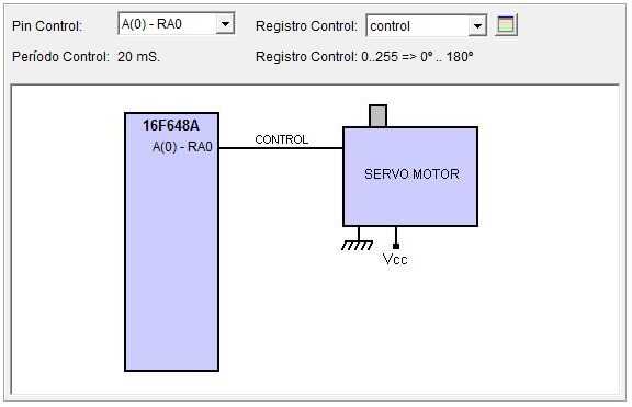 Declaramos el servo motor siguiendo la ruta: "Nuevo Dispositivo – Motor – Motor Servo". Luego configuramos el "Pin de" RA0 y un registro donde almacenaremos el control de (de 0 a 180 grados) con el rango de valores permiso de 0 a 255.
