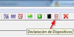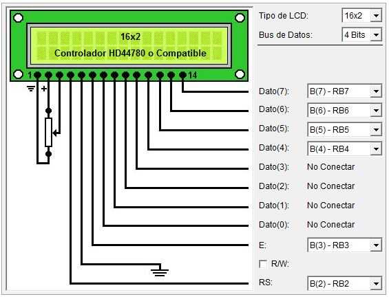 Declaramos el display LCD siguiendo la ruta: "Nuevo Dispositivo – Visualización – LCD". En el campo tipo elegimos el valor "16 x 2", y en bus de datos "4 bits". La configuración de pines es la siguiente: